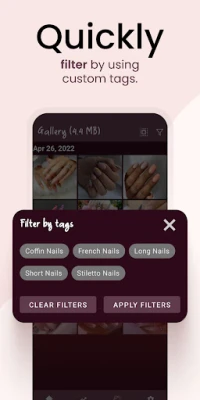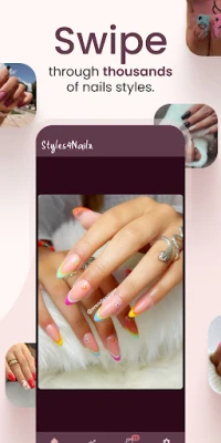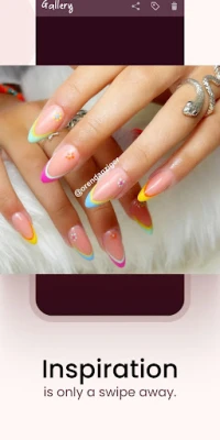 Use the quick swiping controls to like or dislike any nail styles. Explore a ton of nail designs. Swipe right on the designs you like to save it to your gallery. Swipe left to ignore the styles you don't like and move on to the next design.
